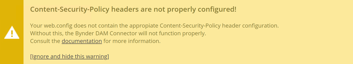 If you see this warning in the Content Editor when you view the DAM Connector Settings item, then this means that your web.config file contains a CSP header configuration that does not allow for Bynder assets to be loaded in the Sitecore Content Editor. ⬇