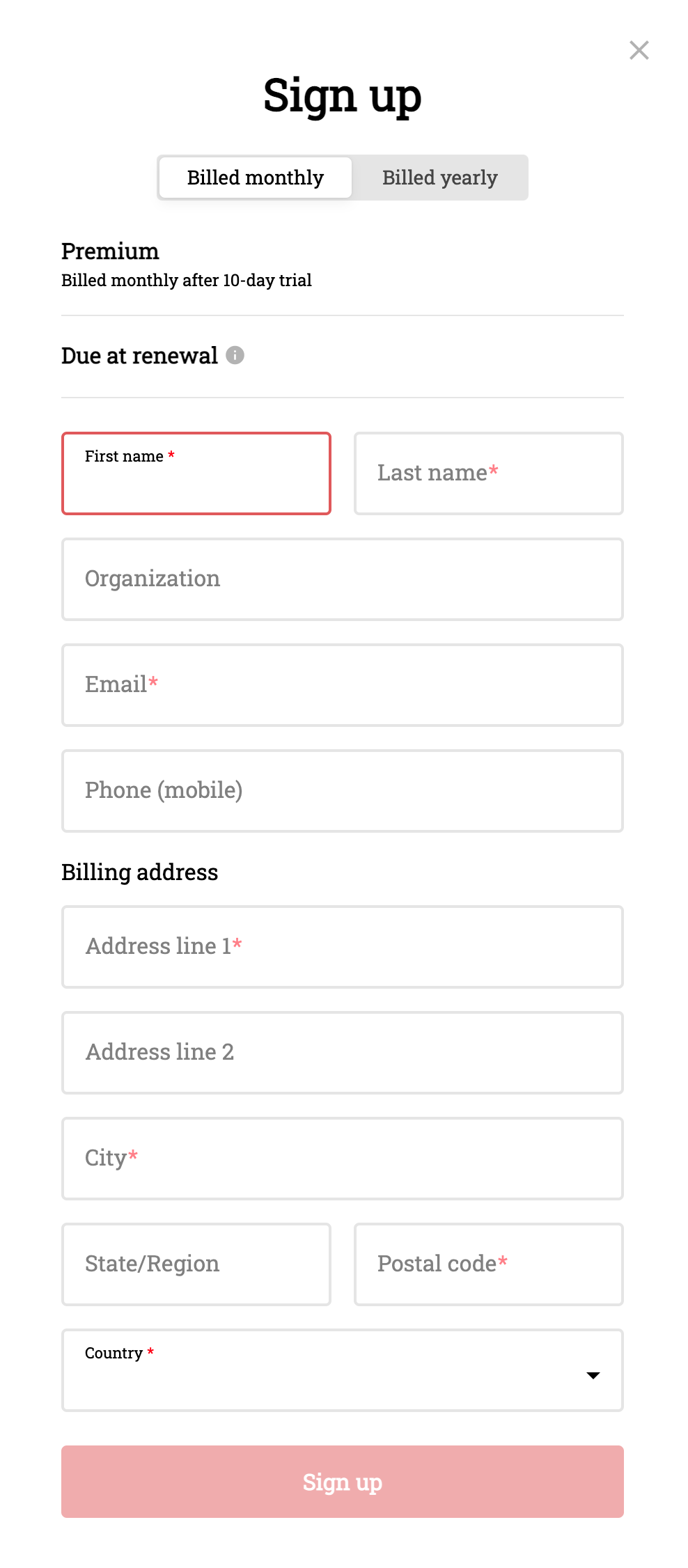 Choose the most suitable subscription level and click Get started to show the sign up dialog.